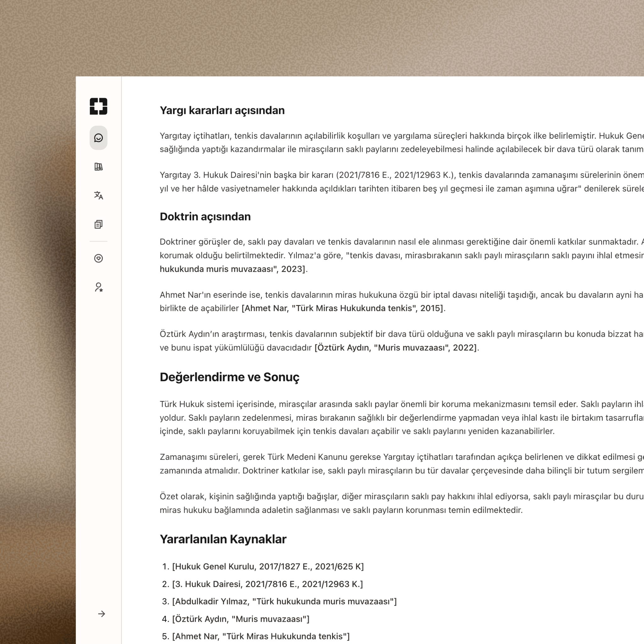 Kanun, içtihat ve doktrine dayalı hızlı ve doğru cevaplar sağlayan, çoklu yapay zeka ajanlarıyla desteklenen sohbet robotu.